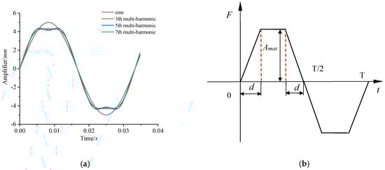 The multi-harmonic waveforms lie between ideal waveforms and simple harmonic waveforms. By superimposing the third, fifth, seventh, or even higher-order simple harmonic waves on the original simple harmonic wave, multi-harmonic waveforms can be obtained. The more harmonics are superimposed, the closer the resulting waveform is to the ideal motion. As the multi-harmonic waveform approaches the ideal waveform, the output power diagram becomes increasingly similar to the ideal power diagram. This is the principle behind improving the pressure ratio and, consequently, the FPSAC performance through the use of multi-harmonic waveforms. Figure 3 illustrates the waveforms of simple harmonic and multi-harmonic waves at different harmonic orders. As the order of the multi-harmonic wave increases, its waveform becomes closer to the ideal waveform. Figure 3a displays the multi-harmonic waveform and Figure 3b shows the ideal waveform.