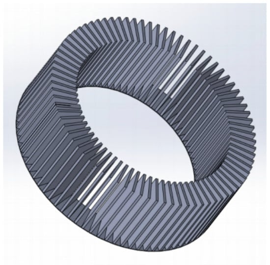 For the heat exchangers used in Stirling air conditioners, the channels of both the cold-and hot-end heat exchangers are modeled as fins with equal cross-sectional areas for the purpose of computational analysis. Each fin has a length of 4.4 mm, a width of 0.3 mm, and a height of 12.5 mm, with a total of 90 fins arranged in a circular pattern, as shown in Figure 4. These fins play a crucial role in regulating the wall temperature by increasing the contact area with the fluid, thereby reducing convective heat transfer resistance and improving the temperature differential between the compression and expansion chambers. Based on the heat transfer calculation formula for fins with equal cross-sectional areas, the heat transfer rate for both the cold- and hot-end heat exchangers was calculated as follows: