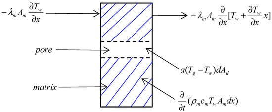The regenerator matrix, unlike other thermodynamic subsystems in the Stirling air conditioner, can be simplified as a capillary porous medium, as illustrated in Figure 5. The thermal balance equation for the regenerator matrix is discretized as shown below: