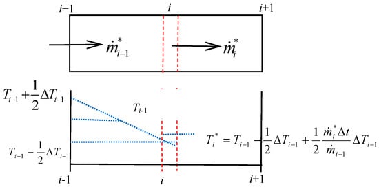 Given the number of variables, the current system of equations is not yet closed. To resolve this, the relationship between the boundary temperature and the unit temperatures must be defined. When the boundary temperature is approximated as the average of the adjacent unit temperatures, it may result in numerical instability in the solution. This is because the choice of the control volume boundary temperature not only influences the computational accuracy but also affects the stability of the numerical solution. Applying an improved upwind differencing method can help mitigate instability. As depicted in Figure 6, it is assumed that the working fluid within the regenerator exhibits the same axial temperature gradient as the matrix, let , and take the integration step size as Δt. Within the interval Δt, the mass of the working fluid that will flow through the i boundary surface into the i control volume is , as indicated by the shaded part in the figure. Clearly, it is more reasonable to use the average temperature of this mass as the temperature of the fluid passing through the i-th interface. Therefore, we have the following: