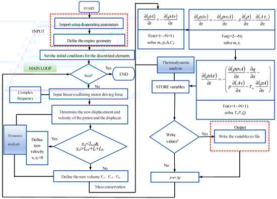 A fully explicit numerical method was employed to solve the system of control equations governing the thermodynamics of the working fluid and the dynamics of the entire machine. The program flow was implemented in MATLAB (2020a), as shown in Figure 7. Initially, the working and geometric parameters of the FPSAC were imported and initialized. Within the main loop, the time step for the motion of the power piston and displacer was calculated. Subsequently, the driving force of the linear oscillating motor was determined, and the mechanical output work was computed under its influence. Using the newly calculated positions of the displacer and power piston, the volumes of the expansion and compression chambers were then updated. The conservation of the mass, momentum, and energy equations, along with the ideal gas law, were applied to determine the new ‘gas thermodynamic’ states for each control volume, numbered from 1 to N. Before proceeding to the next time step, the program updated the ‘old’ variables by storing the ‘new’ values. A conditional function was used to determine whether the output data should be saved to memory, after which the program advanced to the next time step. By using the air conditioner efficiency as a thermal convergence indicator, it was found that a highly accurate dynamic steady-state result could be achieved within the first 150 cycles.