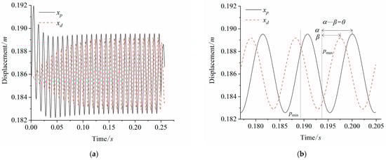 The pressures acting on the compression chamber and expansion chamber are represented by Pc(Ad − As) and PeAd, respectively. The backspace pressure is PbsAs, and the spring force is KdΔxd. There is a friction force τdpAzs between the displacer shaft and the piston, and there is also a fluid shear friction τdAzd between the displacer and the port. Ignoring gravity, the forces acting on the power piston include the compression force and the backspace pressure, represented by (Pc − Pbs)(Ad − As), the spring force KpΔxp, and the electromagnetic force Fm exerted by the linear motor on the power piston (see Equation (3)). The net body force acting on the displacer and piston in the positive x-direction is given by the following: