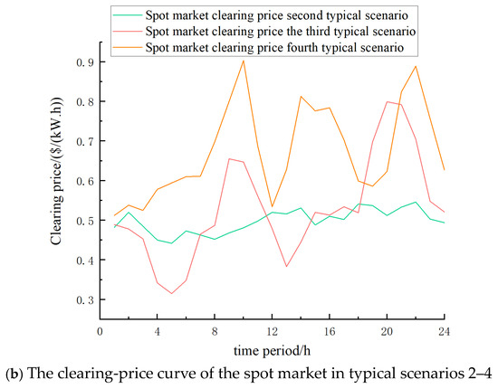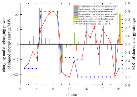 The parameters related to shared energy storage are as follows: the investment and construction cost per unit capacity of shared energy storage = 600 yuan/kWh, the discount cost per unit charging and discharging power = 0.1542 yuan/kWh, the discount rate = 5%, the charging and discharging efficiency , the planning period = 15 years, the leasing price per unit capacity = 0.3142 yuan/kWh, and the conversion coefficient = 0.85. The initial value of state of charge (SOC) for shared energy storage is 0.2, with maximum and minimum values of 0.9 and 0.1, respectively. Shared energy storage participates in spot market trading as a price receiver [38,39].