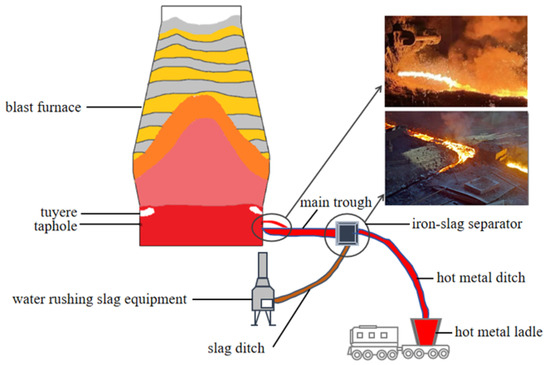 Blast furnace (BF) ironmaking is a crucial process in steel production. During BF operation, iron ore is reduced at high temperature to obtain hot metal and slag [1]. The process of discharging the hot metal and slag is called tapping. As shown in Figure 1, when tapping from the BF, the hot metal with larger density first flows out through the taphole. As the slag level in the furnace decreases, the slag that is composed of unreacted oxide components flows out. The hot metal and slag flow along the main trough, then they separate from each other in an iron–slag separator [2]: the slag flows in the slag ditch to water rushing slag equipment, while the hot metal flows in the hot metal ditch to the ladles.