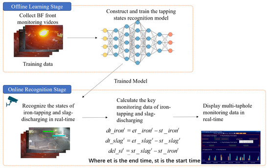 Currently, BF monitoring systems are widely applied for monitoring various BF operation statuses. Among them, the BF front monitoring system uses a camera installed near the tapholes to capture real-time operation of the BF front. Consider that the hot metal and slag flow through the main trough and slag ditch, whose image features during the tapping cycle are obvious. Thus, in this paper, we use object detection techniques to identify the states of the main trough and slag ditch, and establish a mapping between image features and the states of iron tapping and slag discharging. The framework of our approach is shown in Figure 2.