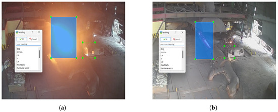 Take the images captured from the BF front monitoring system as an example. As shown in Figure 3a, it is evident that there is molten iron splashing in the main trough and bright light in the slag ditch. Therefore, we mark the tapping area and annotate it with the “iron-tapping” label, as indicated by the blue box in Figure 3a. Similarly, the green box on the right marks the slag-discharging target and is annotated with the “slag-discharging” label. As a comparison, an image with “non-iron-tapping” and “non-slag-discharging” labels is shown in Figure 3b.