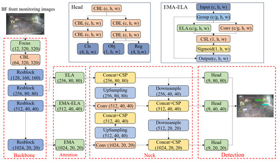 Multi-scale feature maps are output by the backbone network. To offer more precise features for better feature fusion in the neck network, we attempted to add an attention network after the backbone. We tested several attention mechanisms and found that efficient local attention (ELA) [22] performed best in the slag-discharging task while efficient multi-scale attention (EMA) [23] performed best in the iron-tapping task, whose performance and discussions are shown Section 3.2.2. Considering that the slag-discharging region is small, attention may mainly act on shallow features, while the feature information of iron tapping is much richer, where more attention should be paid to the deep semantic features. Therefore, we applied the ELA module for the high-scale features and the EMA module for the low-scale features. For the middle-scale features, we used a model combining EMA and ELA for feature augmentation.