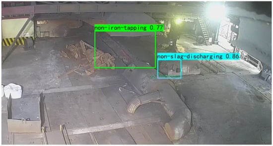 After training the model, we used it to recognize the tapping states. Take the image in Figure 5 as an example. The model could successfully detect two targets: “non-iron-tapping” and “non-slag-discharging”, whose confidence scores were 0.77 and 0.86, respectively. Since there was no obvious tapping features in the main trough and the slag ditch, the inference result was consistent with the observation. Furthermore, the inference time was 0.11 s per image, which can satisfy the real-time recognition requirement.