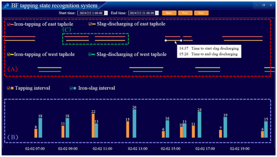 The BF is equipped with two distinct tapholes: the eastern and western ones. The upper section of Figure 7, labeled as zone “A”, depicts the status of each tapping cycle. Distinct horizontal lines, each in a unique color, represent the iron-tapping and slag-discharging activities in the respective tapholes. This allows operators to swiftly identify the start and end times, duration, and potential alternatives for multi-taphole operations. Specifically, when the mouse cursor is hovered over a line, details of the specific tapping cycle emerge. For instance, Figure 7 shows that the slag discharge commences at 14:37 and terminates at 15:26.