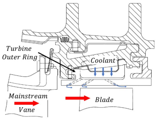 The turbine outer ring is located outside the turbine blades within the casing and forms the working passage for the turbine blades through a circumferential segmented structure. A typical turbine outer ring structure is shown in Figure 1 []. To ensure the safety of the turbine blade tips, a wear-resistant coating is often applied to the outer ring wall to reduce blade damage during rubbing. This results in the thickness of the film cooling hole plates in the turbine outer ring being greater than that of other components, such as the blades. Additionally, the relatively low thermal conductivity of the coating hinders the transfer of internal cooling effects to the hot side wall, making film cooling in the turbine outer ring even more critical compared to other components.