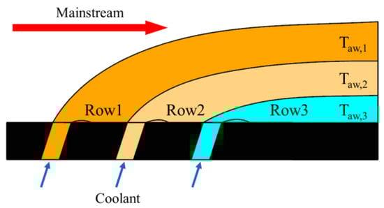 where the subscript denotes the -th row of film holes and , , , and correspond to the mainstream temperature, the adiabatic wall temperature generated by the film cooling, the mainstream temperature correction factor, and the mixed mainstream temperature at the position of the -th row of film holes, respectively.