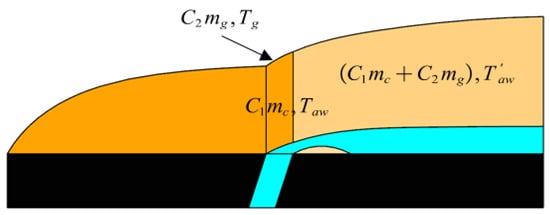 As shown in Figure 3, when the coolant flow is injected, the boundary layer thickness experiences a sudden increase. If the coolant mass flow rate is , an excess thin layer with a mass flow rate of is generated. At this point, the mass flow rate of the mainstream entering the boundary layer is . Based on the principles of energy conservation, the mainstream temperature at the downstream row of holes can be determined, as shown in Equation (3).
