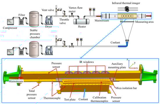 The experimental system, as illustrated in Figure 4, consisted of two primary flow paths: the mainstream for simulating high-temperature airflow and the coolant for film cooling. Prior to entering the test chamber, both flows passed through a honeycomb structure and a damping mesh to ensure uniformity. A pressure stabilization chamber was also installed at the coolant inlet to further minimize non-uniformities. The mainstream channel had a height of and a width of , with the first row of film cooling holes located downstream from the mainstream inlet.