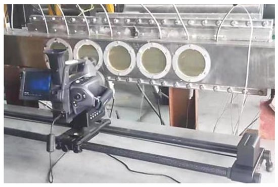The infrared camera was positioned directly opposite the test plate. Due to the difficulty of capturing a wide field of view under high-resolution conditions, an electric sliding rail was installed beneath the infrared camera, parallel to the mainstream cavity, allowing the camera to move along the direction of the hot air flow. This setup ensured that each infrared window could be imaged under consistent operating conditions, as illustrated in Figure 5.