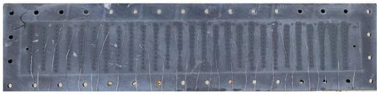 The test plates were fabricated using photosensitive resin with an extremely low thermal conductivity, approximately , using 3D printing technology, providing nearly adiabatic conditions, as shown in Figure 7. To minimize the impact of flow non-uniformity within the cooling air cavity on the exit airflow from the film holes, the thickness of the test plates was set to , ensuring an aspect ratio of approximately 5 between the length and diameter of the cooling holes.