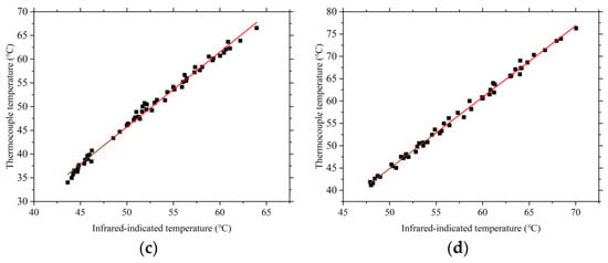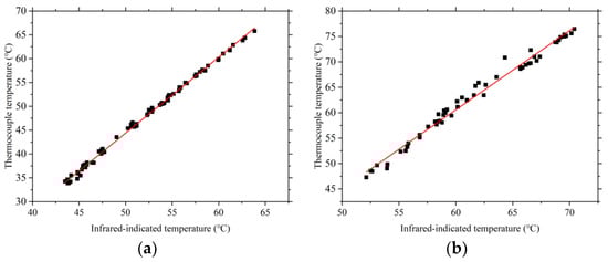 The infrared temperature distribution results for different test plates were calibrated using thermocouple measurements, as illustrated in Figure 8. Across different test plates, a relatively linear relationship was observed between the infrared data and thermocouple readings, indicating a certain degree of reliability in the results. The calibration formula is provided in Equation (12).