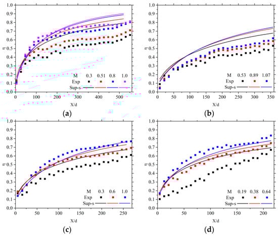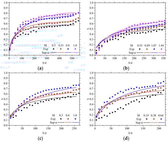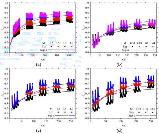 where represents the temperature after mixing. Harrington et al. [] argued that a superposition model based on the single-row film cooling efficiency distribution tends to overestimate the overall film cooling efficiency. Therefore, the empirical coefficients and are both positive values.