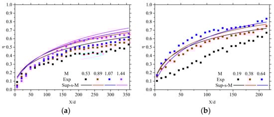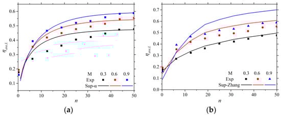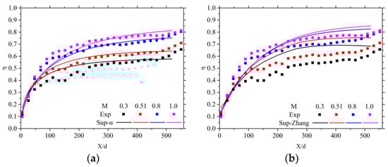 Comparison of the superposition model based on mainstream temperature correction ()-predicted spanwise-averaged cooling efficiency () and Zhang’s model ()-predicted results along the non-dimensional streamwise direction () for of Zhang’s study (): (a) predicted results using the superposition model based on mainstream temperature correction (); (b) predicted results using Zhang’s model ().