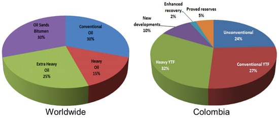 Oil production is a constantly evolving field that demands continuous technological advances to make it profitable and sustainable. Conventional crude oil is the easiest to produce, while heavy and extra-heavy oil require higher expenses. The role of driving these technological advances is crucial []. Heavy oil’s high viscosity directly impacts the recovery and productivity of a reservoir because the difference compared to water’s viscosity creates an unfavorable mobility ratio. This allows water to flow faster, thus displacing the oil production from producing zones []. In countries like Colombia, this situation can be dramatic because the existing reserves of heavy crude are significantly greater than that of conventional crude [,,]. Consequently, besides being a more expensive extraction operation that may even become unprofitable in cases where the market price of oil is low, it requires considerable energy consumption, creating a more significant impact on the CO2 footprint. The cost and greenhouse gas emissions directly result from oil’s high water production levels (Figure 2).