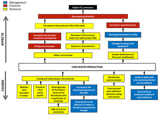 As shown in Table 1, since water flows faster than oil and fluids tend to take the least resistant paths, water goes into the well more quickly to open fractures and high permeability formations instead of displacing the oil [,]. Water also takes advantage of mechanical issues related to the well construction and integrity, increasing water production.