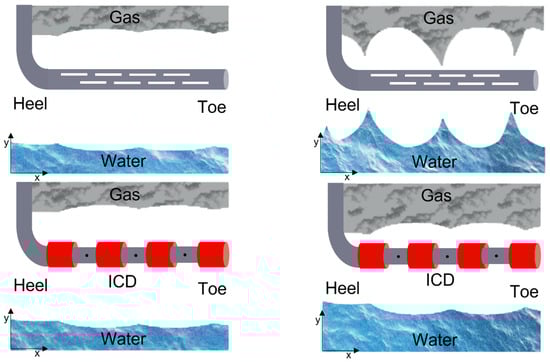 To increase the contact area with the reservoir, horizontal wells are often preferred and considered superior to vertical well completions in situations like thin reservoirs, edges, and bottom-water reservoirs []. However, reservoir heterogeneity and the heel–toe effect create an uneven influx of fluids along the horizontal section, leading to problems such as water coning/cresting, the early breakthrough of water, and imbalanced production profiles [,,]. Once water breakthrough occurs, usually via coning near the heel, oil production decreases significantly because of the limited flow contribution from the toe (i.e., non-coning section) [].