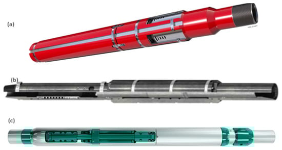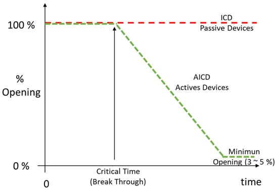 An ICV is an active downhole flow control valve operated remotely and in real time through hydraulic, electric, electro-hydraulic, or wireless actuation systems []. Measurements such as the flow rate, pressure, temperature, and water cut, individually or in combination, provide the necessary information to control the inflow from individual reservoir zones reactively []. Different ICV designs are commercially available (Figure 6), ranging from on/off to infinitely positioned valves. Discrete-position ICVs have between 2 (i.e., on/off) and 12 opening positions that vary from fully open to fully closed and are actuated with electro-hydraulic systems. In contrast, variable-position ICVs can have any desired opening size and are usually controlled with electrical systems []. The major limitation of electric and hydraulic actuation systems requires installing control lines, which can be overcome with control-line-free Radio Frequency Identification (RFID), a small electronic chip that conveys ICV instructions wirelessly [,]. They can be managed by reservoir simulation models that are continuously updated with the information provided by monitoring systems installed along the wellbore length [], thus leveraging the Digital Twins of the wells.