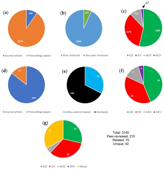 Distribution of the available papers in OnePetro: (a) total papers by type; (b) total papers by review status; (c) total papers by search term; (d) peer-reviewed papers by type; (e) peer-reviewed papers by relation with inflow control; (f) peer-reviewed papers by search term after filtering; and (g) unique peer-reviewed papers by search term after filtering.