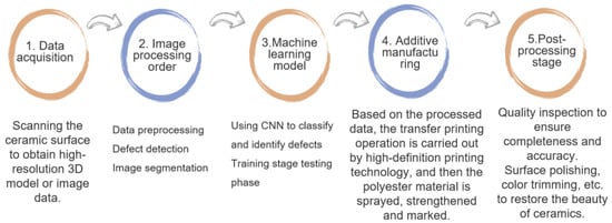 The reasonable application of an adaptive ANN learning algorithm can efficiently assist in the optimal design of printing process parameters in the AM stage, which provides a brand-new design idea for AM technology. The image restoration stage of AM ancient ceramics is shown in Figure 2.