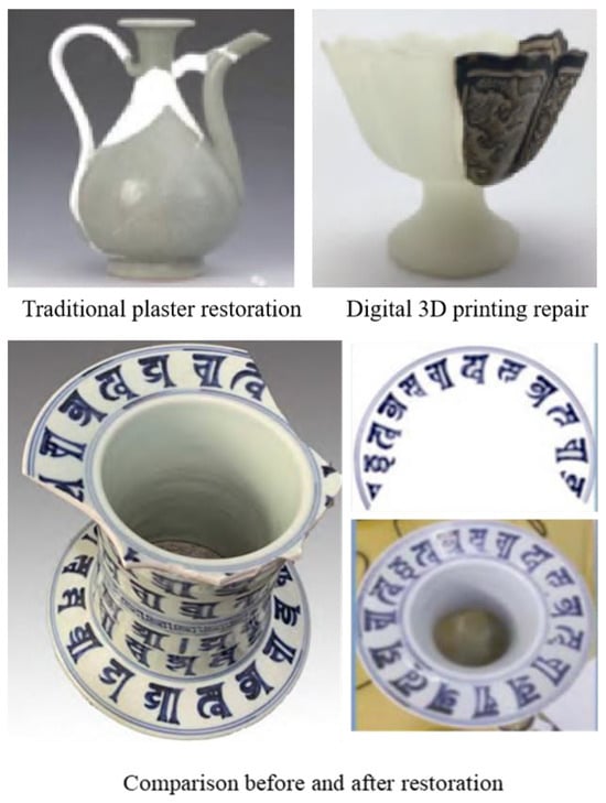 Compared with other countries, China has a very long history of ceramic production, and ceramics also hold a very important position in the history of China. Among the numerous historical relics in China, ceramics contain information about specific historical periods and have rich historical, artistic, cultural, and scientific value [1]. When ceramics are damaged, their value is greatly reduced, and it is easy to cause secondary damage. The restoration of ancient ceramics is not only a traditional skill, but it also embodies the concept of value in traditional cultural relics and traditional craft. Modern cultural heritage theory has placed new demands on this concept. Modern restoration materials and intervention methods have not only provided new conditions for the restoration of ancient ceramics, but also differ in some ways from the ideal restoration concept [2]. If these damaged ancient ceramics are not treated in any way, the historical value, artistic value, and cultural value of these artifacts will not be apparent [3]. Based on key technical problems such as low weathering resistance, low bond strength, low discoloration resistance, and irreversible human interference in the current process of restoring cultural relics, the innovative growth of ancient ceramic restoration materials continues to be promoted [4]. The digitalization of artistic works uses existing digital technology to process the accurate digital data of works of art. By scanning some excellent works of art and storing data in computers, the virtual digitization of works of art can be realized [5,6].