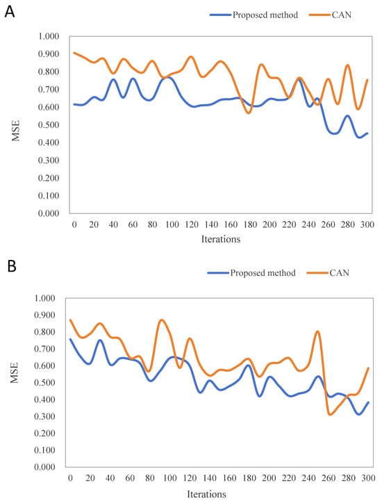 MSE of different image inpainting algorithms applied to the training set and test set. ((A) training set; (B) test set).