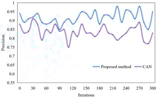 When the ML algorithm is used to train the model, the model obtains image features through continuous iteration, and then adjusts parameters. According to the theory, the greater the number of iterations, the better the result of the model. However, the limited data limit the characteristics obtained by the model, and make the model training converge. After each iteration, the feedback accuracy of the test set is used for judgement, and the best iteration results are saved. In this experiment, we set the maximum number of iterations to 300, and fixed the optimization accuracy of each algorithm. The total number of all algorithms is set to 20, and all test function dimensions are set to 40. We repeat each experiment 10 times, and stop the iteration when the optimization error of the algorithm is less than 0.001. The results of the experiment are shown in Figure 5.