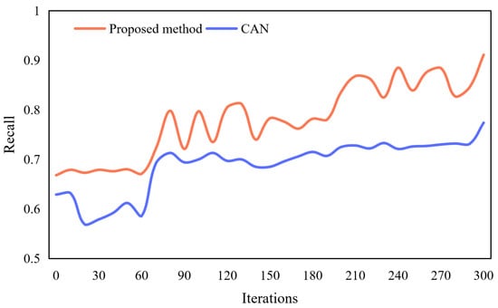 Compared with the traditional CAN, the accuracy of this algorithm is improved by 28.64% (Figure 10). The classification model of ceramic image features based on bottom features is more accurate than the classification model based on advanced statistical features. In this improved model, the convergence speed of CNN parameters is faster and the classification accuracy is higher. This method obtains an ideal ceramic image feature recognition result, and the recognition accuracy is higher than that of other ceramic image feature recognition methods. Figure 11 shows the result of a comparison of recall rates of ancient ceramic image recognition algorithms.