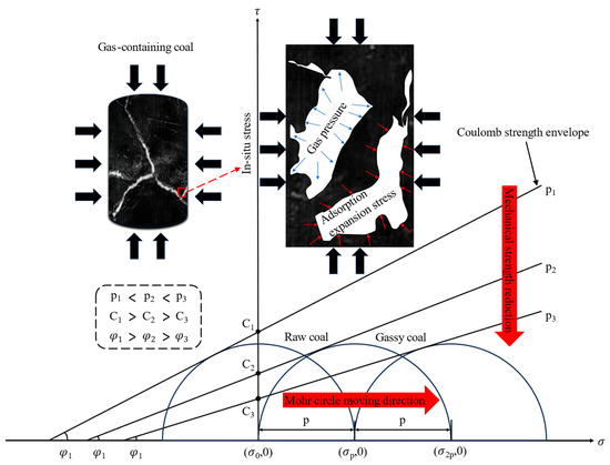 The deformation and failure of gas-bearing coal are governed by the external stress and the mean pore gas pressure. As depicted in Figure 2, the mechanism through which gas pressure impairs the mechanical characteristics of gas-bearing coal is presented. Specifically, the Mohr circle associated with gas-bearing coal progressively migrates to the right. The strength line of gas-bearing coal exhibits a diminished τ intercept in comparison to that of ordinary coal. This implies that an augmentation in gas pressure not only diminishes the peak strength and elastic modulus of gas-bearing coal but also curtails the cohesion and internal friction angle, thereby leading to a reduction in mechanical strength. Such a variation in the mechanical strength parameters of gas-bearing coal is manifested by the cohesion [19]: