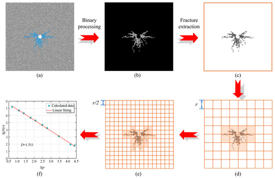 Principle of calculating fractal dimensions via the two-dimensional box-counting method: (a) Fracture image; (b) Image binarization; (c) Fracture extraction results; (d) Grid division with side length r; (e) Grid division with side length r/2; (f) Fractal dimension calculation.