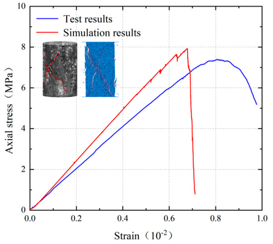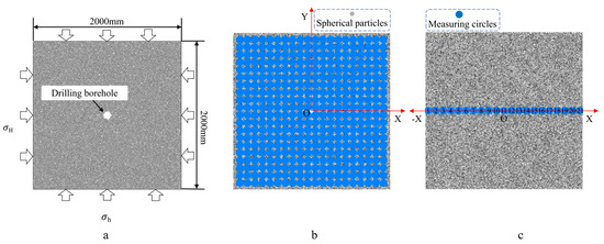 Figure 4 displays the results of parameter calibration for the model; the specific mechanical parameters are shown in Table 1 [21]. A borehole numerical model was constructed, having a height and width of 2 m and the minimum and maximum particle sizes being Rmin = 0.008 m and Rmax = 0.012 m, respectively (Figure 5a). In the simulation, a confining pressure of 10 MPa was set up around the model. Then, the borehole excavation procedure was realized by deleting the circular area with a diameter of 10 cm in the middle of the numerical model. Regarding data monitoring, measurement circles were disposed to monitor the changes in stress and porosity around a borehole with a radius of 0.05 m. The measurement circles were configured to the same size to more accurately obtain the stress and porosity alterations around the borehole, taking the borehole coordinates as the origin. Ten measurement circles were arranged in both the positive and negative directions of the x-axis, and the radius of the measurement circles was fixed at 0.05 m (Figure 5b,c).