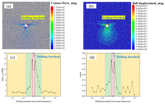 Figure 6 shows the mechanical state evolution around the borehole. A concentrated area of pressure chains is generated on both sides and the lower end of the borehole (Figure 6a); these force chains mainly extend toward both sides of the horizontal side and down the vertical side to the same length, and the particle contact force drops to 1–2 MPa, forming an irregular distribution of force chains [22]. Under gravity and confining pressure, the contact between particles causes extrusion deformation [23]. Figure 6c,d shows the distribution of stress and strain in the horizontal direction of the borehole, respectively, where red, green, and yellow colors indicate the surge area, plunge area, and flat area, respectively. The stress and strain data are monitored through the measurement circle. The vertical stress of the borehole rises sharply at a horizontal distance of 0.05–0.10 m from the borehole, and the maximum and minimum stresses are 13.9 MPa and 1.21 MPa, respectively, −0.1 m from the borehole. The strain values on both sides of the borehole rise rapidly at a horizontal distance of −0.1 to 0.1m from the borehole, and peak strain is reached −0.1 m from the borehole (Figure 6d).