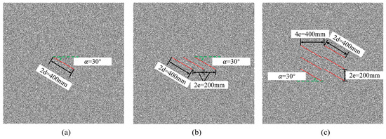 To study the impact of pre-existing fractures on sample strength and fracture evolution features, a discrete fracture network is designed and built with PFC2D. Figure 8 shows coal body models with one, three, and six pre-existing fractures, where the fracture length (2d) is 400 mm. The fractures in all three models are parallel to each other, and the fracture inclination is 30°. The length of the rock bridge in Figure 8b is 2e = 200 mm, whereas the lengths of the horizontal rock bridge and vertical rock bridge in Figure 8c are 4e = 400 mm and 2e = 200 mm, respectively.