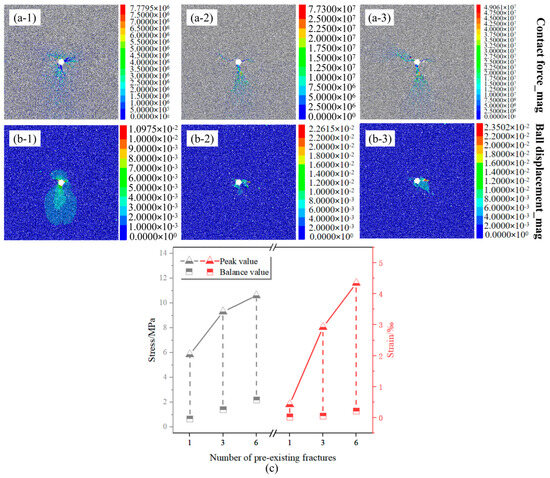 Mechanical state evolution around a borehole with pre-existing fractures. (a) Force chain, (b) coal displacement, and (c) stress and strain evolution in a coal body with an increasing number of pre-existing fractures. (a-1,b-1), (a-2,b-2), and (a-3,b-3) correspond to the models in Figure 8a, b, and c, respectively.