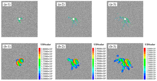 Based on the calculations of shear and tensile fracture numbers and directions (Figure 19), the upward fracture number on all sides gradually grows as gas pressure increases. At 0.5 MPa gas pressure, the borehole fracture inclination angle is mainly 30–50°; it changes to 140–150° and 150–160° at 1.0 MPa and 1.5 MPa gas pressures, respectively.