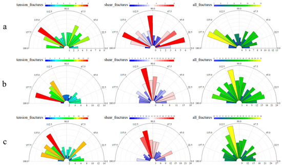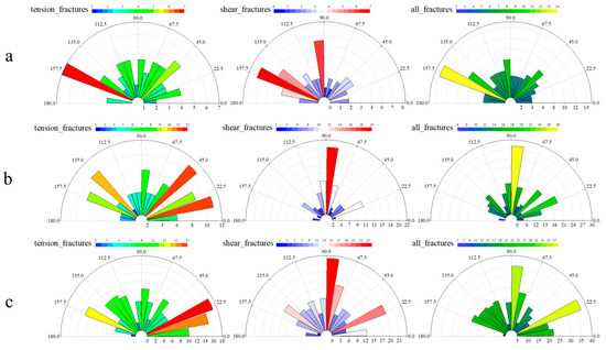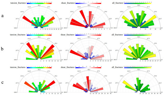 Rose map of tension and shear fracture development around a borehole in a coal body with (a) one, (b) three, and (c) six pre-existing fractures.