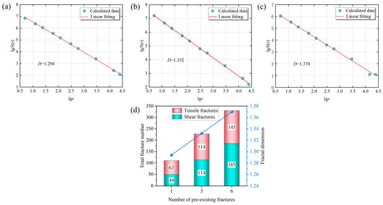 Fractal dimension changes in a coal body with (a) one, (b) three, and (c) six pre-existing fractures. (d) Number of tensile and shear fractures with an increasing number of pre-existing fractures.
