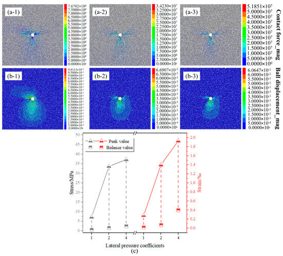 Structural stress has a substantial influence on borehole failure and fracture development in soft coal seams. Three lateral pressure boundary conditions were set using PFC2D-5.00.25 software, where the ratio of lateral stress to axial stress was 1, 2, and 4, respectively. As the lateral pressure coefficient increases, the coal drilling force chain increases, reaching 7.7, 34.2, and 51.9 MPa, respectively (Figure 13a); the coal displacement trend remains approximately the same, although coal displacement around the borehole gradually decreases (Figure 13b), and the stress and strain in the coal seam during drilling and excavation gradually increase, with peak stresses of 7.2, 33.8, and 37.2 MPa and peak strains of 0.0003, 0.0014, and 0.0020, respectively (Figure 13c).