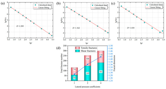 Fractal dimension changes in a coal body with lateral pressure coefficients of (a) 1, (b) 2, and (c) 4. (d) Number of tensile and shear fractures with increasing lateral pressure coefficient.