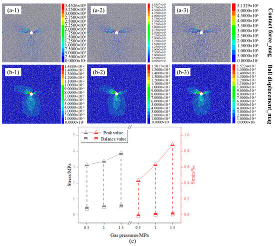 Mechanical state evolution around a borehole with different gas pressures. (a) Force chain, (b) coal displacement, and (c) stress and strain evolution in a coal body, where (a-1,b-1), (a-2,b-2), and (a-3,b-3) correspond to gas pressures of 0.5, 1.0, and 1.5 MPa, respectively.