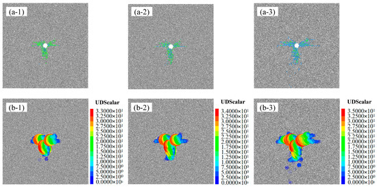 Fracture distribution around a borehole with pre-existing fractures. (a) Fracture distribution and (b) fracture quantity in a coal body with an increasing number of pre-existing fractures. (a-1,b-1), (a-2,b-2), and (a-3,b-3) correspond to the models in Figure 8a, b, and c, respectively.
