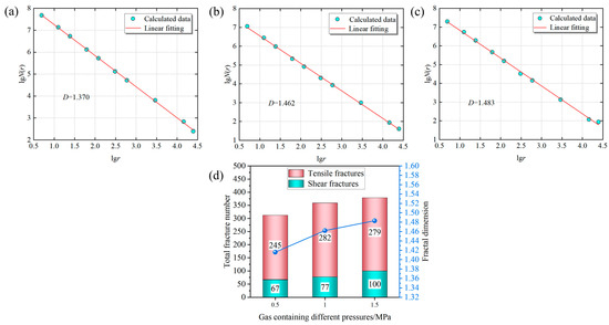 Fractal dimension changes in a coal body with gas pressures of (a) 0.5, (b) 1.0, and (c) 1.5 MPa. (d) Number of tensile and shear fractures with increasing gas pressure.