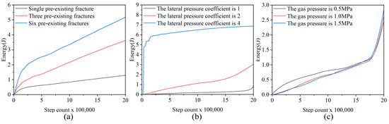 Energy evolution characteristics during drilling in a gas-bearing soft coal seam according to (a) different numbers of pre-existing fractures; (b) different lateral pressure coefficients; and (c) different gas pressures.
