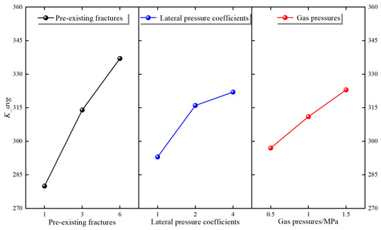 When adopting the orthogonal experimental design, the influencing factors must be clarified and the values of the influencing factors must be set at all levels. Here, the number of pre-existing fractures, the lateral pressure coefficient, and gas pressure were denoted as A, B, and C, respectively, and each was assigned three levels (Table 2). Orthogonal tables can determine the importance and interaction of each influencing factor through a small number of experiments. Each factor and level must be independent of each other and each level of each factor must occur equally frequently in the test scheme. According to the values of each influencing factor in Table 2 and the design rules of the orthogonal table, the orthogonal experimental design table shown in Table 3 is obtained. The scheme of the orthogonal design table was calculated using PFC2D software, and the statistical results are presented in Table 4.