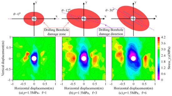 Fracture-dominated failure mainly occurs when the coal seam has a complex fracture network. Here, drilling and excavation lead to many secondary fractures; the fracture density rises, the coal body strength drops, and the borehole is easily damaged. At a coal seam gas pressure of 1.5 MPa, the borehole failure with pre-existing fractures is mostly elliptical (Figure 23), and the failure zone expansion direction gradually matches the pre-existing fracture inclination angle. The horizontal deflection angles are 0°, 12°, and 30° for one, three, and six pre-existing fractures, respectively. Also, the geometric distribution gap of pre-existing fractures is the key factor affecting the fracture area in gas-bearing soft coal seams.