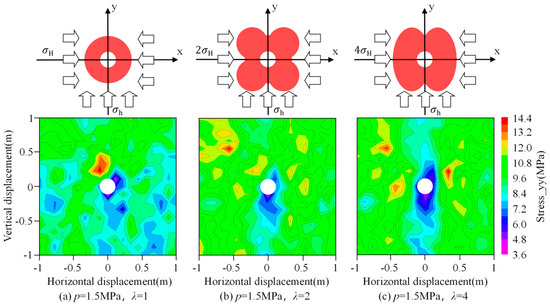 Under high stress, the coal body around the borehole is subjected to tangential compressive stress concentration, leading to tensile failure, as shown in Figure 24. Borehole failure is prone to occur along the direction of maximum principal normal stress. The failure area keeps expanding, and the damage is not very uniform, mainly happening above and below the borehole when the lateral pressure coefficient is 4. This is because a pressure arch structure is formed the borehole, which gradually disappears with increasing lateral pressure with damage of the arch seat, resulting in gradual vertical extension of the damage area in both directions [37].